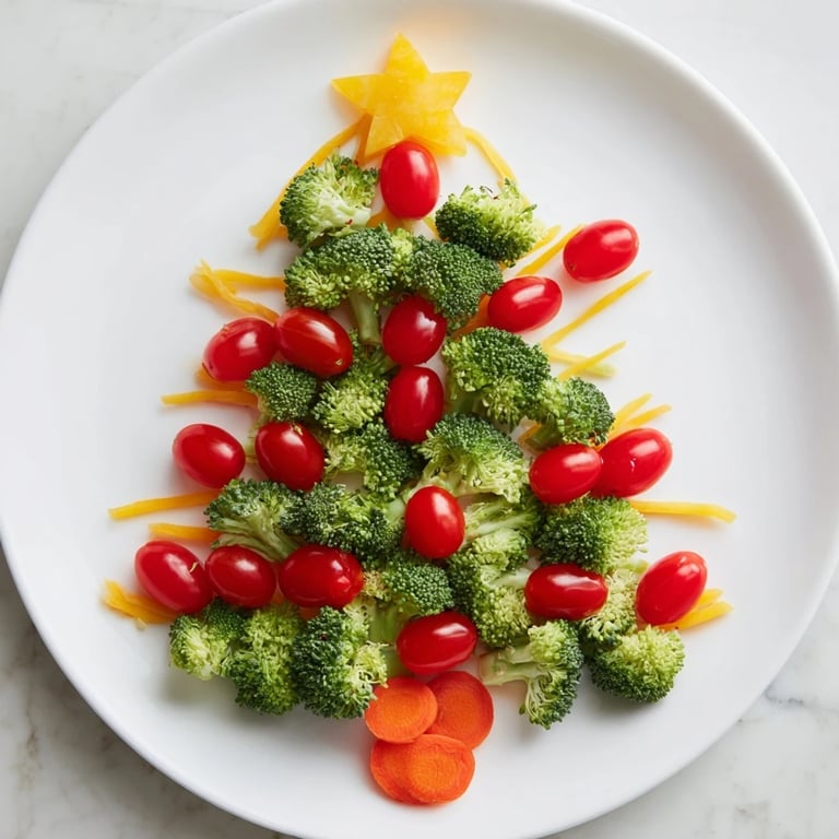 Pin It A whimsical and healthy party platter featuring broccoli florets arranged as a festive tree, adorned with vibrant cherry tomato ornaments. Perfect for holiday gatherings or a fun snack for kids.