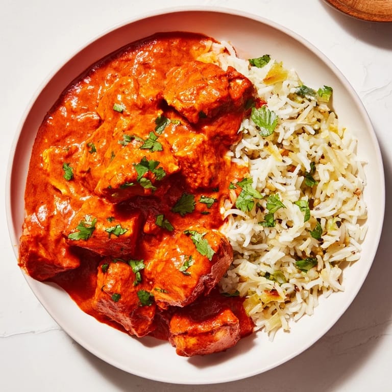 Pin It A classic Indian favorite featuring tender chicken in a rich creamy tomato sauce paired with fragrant basmati rice pilaf. Perfect for a comforting meal full of flavor and spice.
