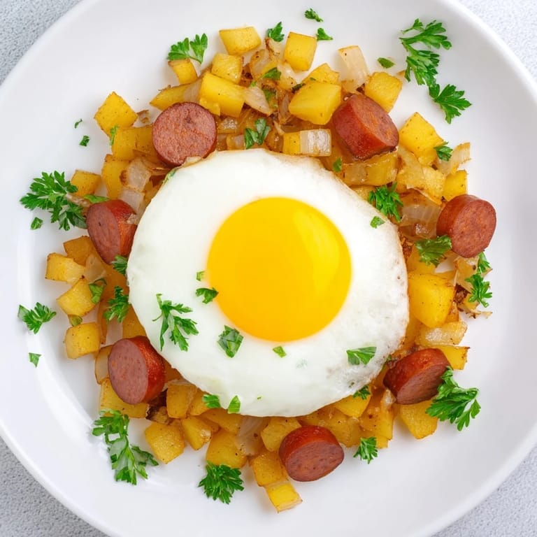 Pin It A hearty comforting skillet dish featuring crispy potatoes sautéed onions and sliced hot dogs finished with perfectly cooked eggs. Ideal for breakfast brunch or a quick dinner.