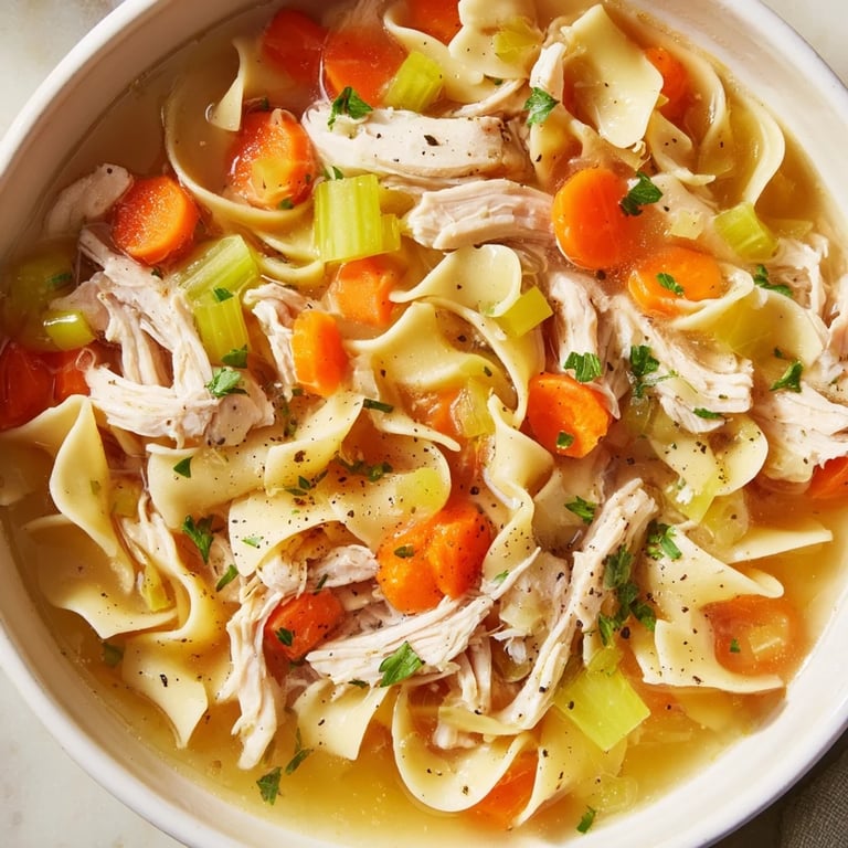 Pin It A comforting classic, this homemade chicken noodle soup features tender chicken, hearty vegetables, and egg noodles simmered in a flavorful broth. Perfect for chilly days or when you need a soothing meal.