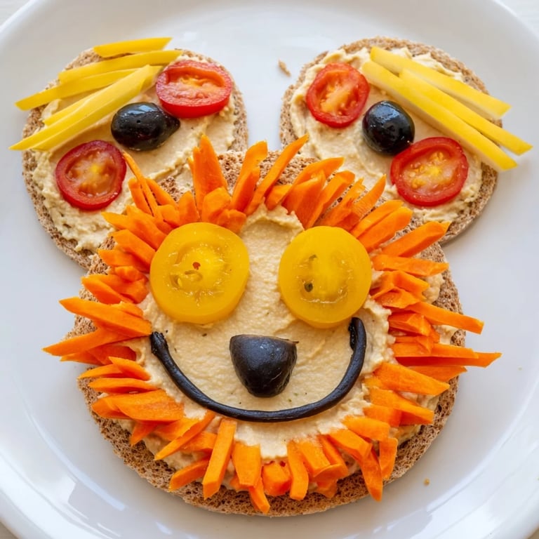- Main Board Components: 4 whole wheat sandwich thins (for lions face), 1 cup hummus or cream cheese (for spreading), 1 cup shredded carrots (lions mane), 1 cup orange bell pepper strips (lions mane), 1 cup yellow cherry tomatoes, halved (mane accents), 1 cup cucumber slices (face accents), 8 black olives, pitted and sliced (eyes, nose, whiskers), 1 small apple, sliced (lions mouth), 4 slices cheddar cheese (cut into triangles for ears)