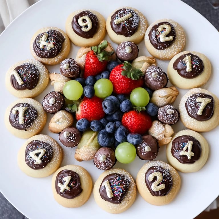 Pin It A festive dessert platter featuring elegant, sparkling treats arranged in the shape of a clock—perfect for counting down to midnight on New Years Eve.
