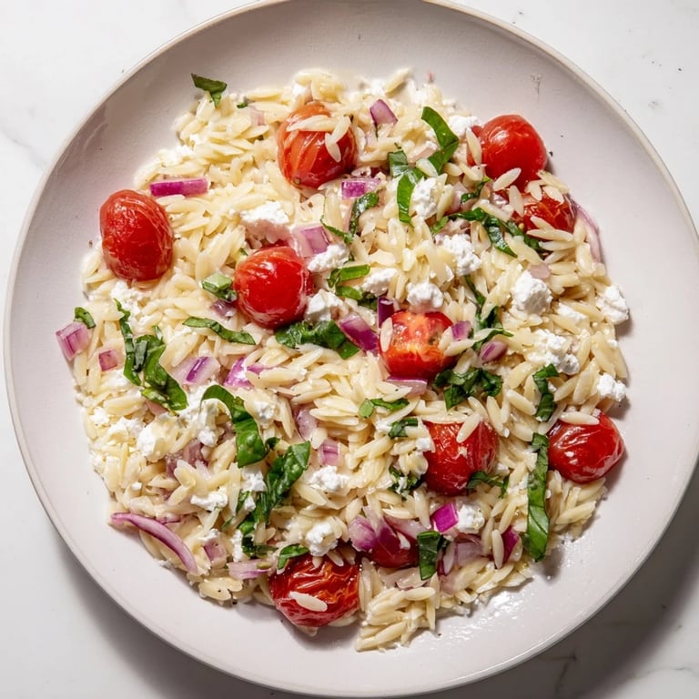 Pin It I discovered this salad on a sweltering afternoon when my neighbor dropped off a basket of cherry tomatoes from her garden, more than either of us could eat fresh. Standing in my kitchen with the afternoon sun streaming through the window, I decided to toss them into something cool and substantial, something that wouldn't heat up the kitchen further. The orzo caught my eye—I'd been meaning to use it—and within minutes I was whisking together a simple dressing, watching how the flavors seemed to bloom as everything mingled together.