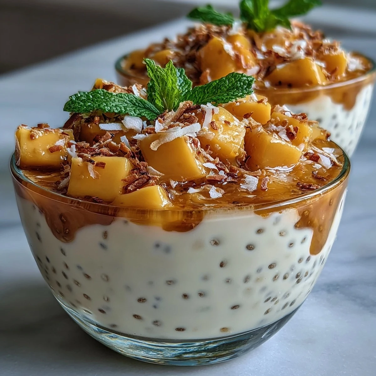 - Top with a dollop of coconut cream, diced fresh mango, toasted coconut flakes, and mint leaves. Serve chilled.