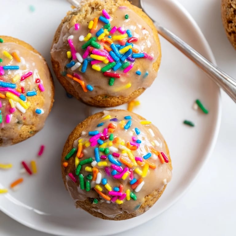 Pin It Moist, coffee-infused muffin donuts bursting with colorful sprinkles and finished with a light glaze—perfect for a festive breakfast or snack.