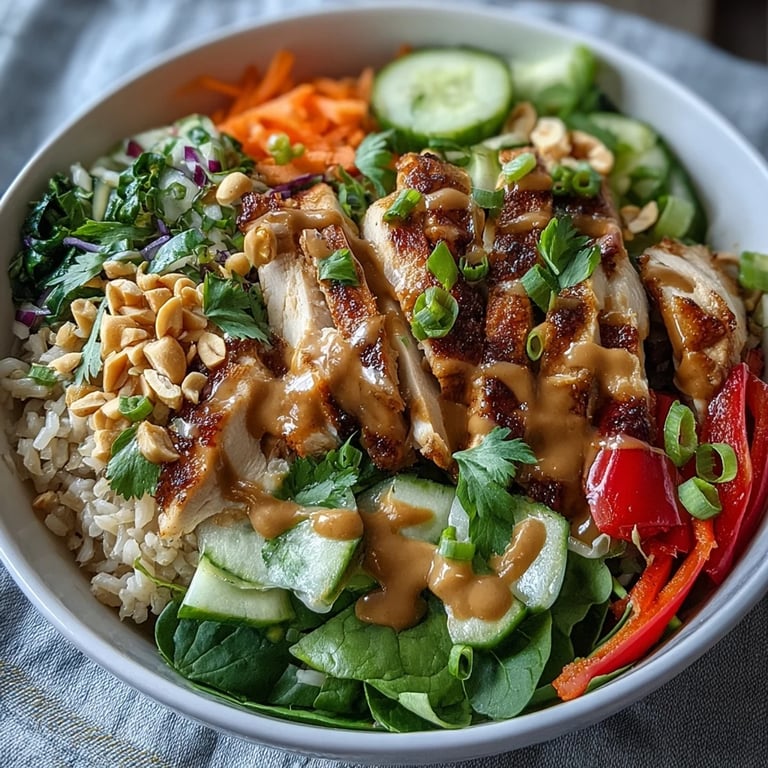 I almost always make extra because these bowls are fantastic the next day. Store the components separately in airtight containers, grains and chicken in one, vegetables in another, sauce in a small jar. When youre ready to eat, reheat the grains and chicken gently in the microwave, then build your bowl fresh with cold or room temperature vegetables. The peanut sauce keeps in the fridge for up to a week and honestly, I use it on everything from noodles to roasted broccoli.